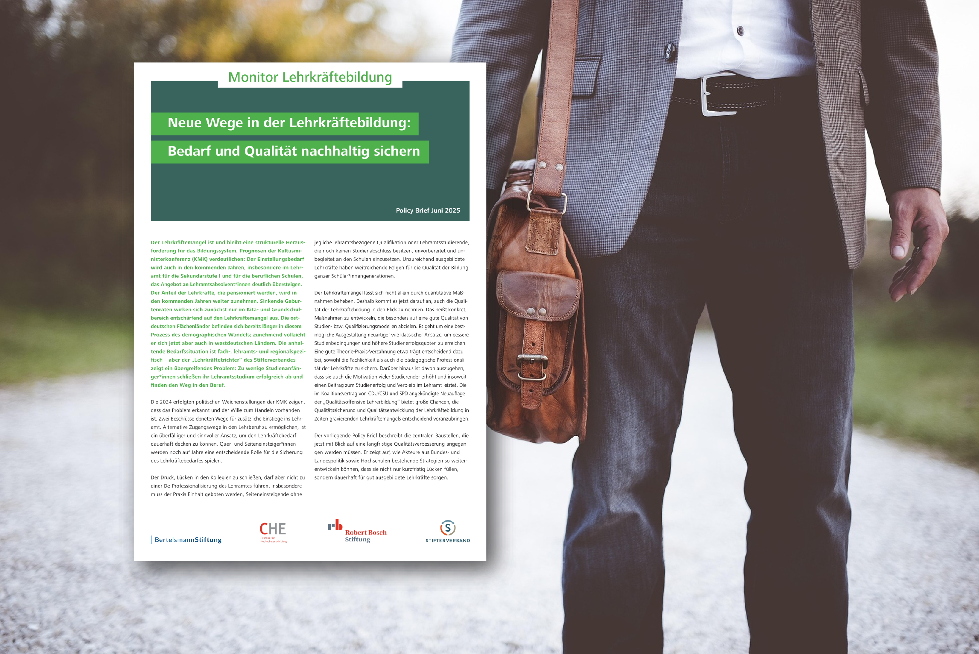Ein aktueller Policy Brief des Monitor Lehrkräftebildung zeigt anhand neuer Daten aus dem Wintersemester 2024/25 den bundesweiten Status quo. Das 2011 gestartete Bündnis, dem die Bertelsmann Stiftung, das CHE Centrum für Hochschulentwicklung, die Robert Bosch Stiftung GmbH (seit 2018) und der Stifterverband angehören, zieht nun eine erste Bilanz: