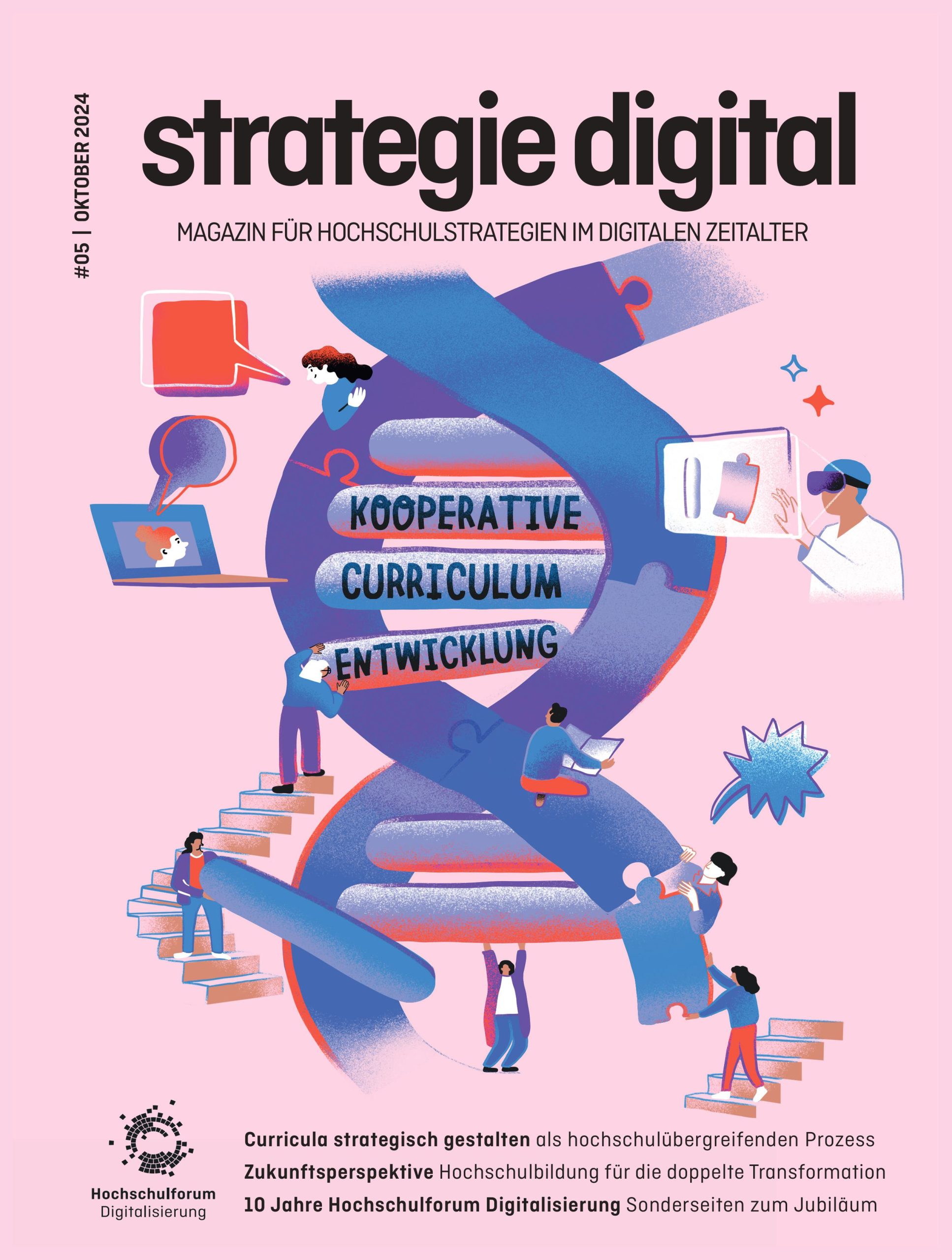 Seit Oktober 2021 gibt das Hochschulforum Digitalisierung für alle Strategie-Interessierten das Magazin strategie digital | Magazin für Hochschulstrategien im digitalen Zeitalter heraus. Das Magazin erscheint jährlich und ist kostenlos verfügbar. Jede Ausgabe widmet sich einem Themenschwerpunkt, welches aus verschiedenen Blickwinkeln betrachtet wird. Die aktuelle Ausgabe von Herbst 2024 beschäftigt sich mit “Kooperativer Curriculumentwicklung”. Eine bunte Auswahl von Autor:innen – Hochschulleitungen, Lehrende, Studierende und weitere Expert*innen rund um das Hochschulsystem – bringen ihre Erfahrungen und Erkenntnisse zur Digitalisierung in Studium und Lehre ein. Ergänzt werden die Beiträge mit Updates aus dem Hochschulforum Digitalisierung. Weitere Ausgaben des Magazins thematisieren “Zukunftsorientierte Lernräume”, “Partizipation”, “Blended University” und “(Digital) Leadership”.